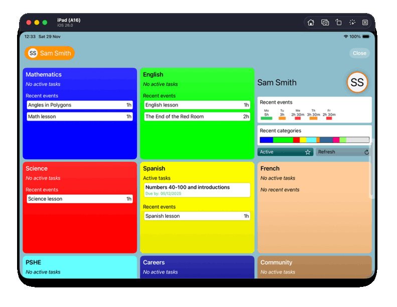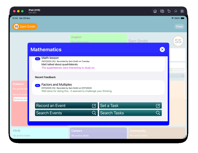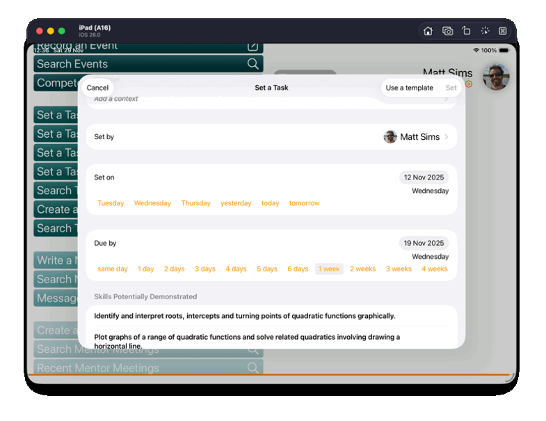The Meadows Montessori High School required an iPad app that would enable teachers to set tasks for students, specify deadlines, link tasks to subject curricula, and provide feedback once work was completed. Students needed to be able to access assigned tasks, record the work they have completed, and reflect on their progress. Additional requirements included advanced data search functionality and the ability to export PDF reports for printing. Whilst being rich it functionality, the app needed to be intuitive to use and not feel like a burden for its users.